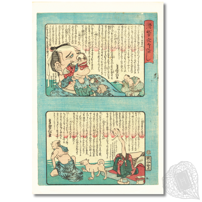 A comical woodblock print by Utagawa Yoshimori (1830-1885), introducing seven character flaws across two scenes. The nishiki-e, number five of an indeterminate number of prints in Yoshimori's Kokkei Ana-sagashi series, describes characters using idioms and illustrates them in a literal sense. For example, a dog with human hands where his front paws should be is depicted in the centre of the lower scene, representing the idiom "even a dog's paw is better than nothing". The dog's desire to help his master is expressed through his internal monologue in the text above. Yoshimori also uses homophones and wordplay to engage his audience; the man in the top right stealing kasuri 絣 (splash patterns) from a kimono is described as a kasuri wo toru hito: a person who takes kasuri 掠 (a cut of illegal gains). Other characters pictured include a man with a belly where his back should be - a depiction of the idiom "you can't trade your back for your belly", meaning "to accept something with resolve" (i.e. you have to sacrifice something to protect something vital) - and a man with a long neck representing the idiom kubi wo nagakusuru ("to stretch one's neck", meaning "to wait impatiently for something"). A colourful and entertaining print by Yoshimori, one of Kuniyoshi's pupils.