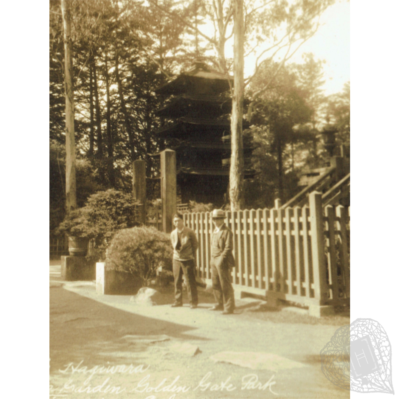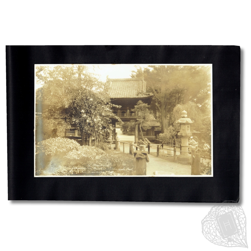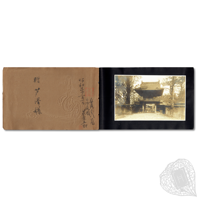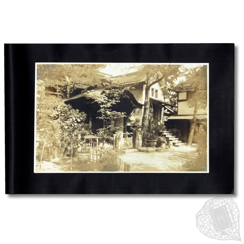An album containing sixteen large tipped-in monochrome photographs captured around the 1930s of the Japanese Tea Garden in San Francisco. The verso of the upper wrapper of the album bears the signature and seal of Hagiwara Gorō and the inscription (in Japanese): “Gifted to Mr. Ashizawa, March 1, Showa 11 [1936], San Francisco Golden Gate Park, Japanese Garden, Hagiwara Gorō”. Gorō was the son-in-law of landscape designer Hagiwara Makoto (1854-1925), who maintained and expanded the Japanese Garden until his death (and, incidentally, is credited with inventing the fortune cookie).