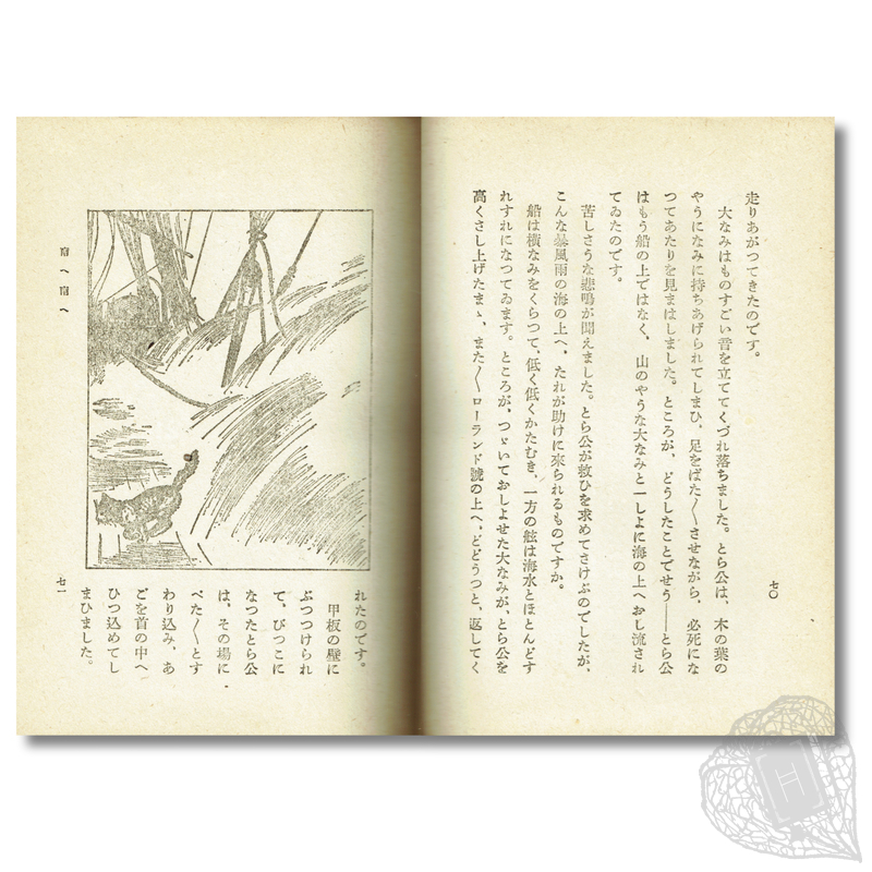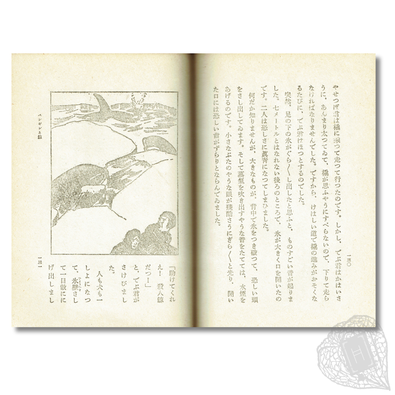 An adaptation of Ruth and Latrobe Carroll's Luck of the Roll and Go (first published New York: Macmillan Co., 1935). The children's book follows the adventures of Luck, a kitten who stows away on the "Roll and Go", a ship bound for Antarctica. The translator, Koide Shōgo (1897 1990), was a prolific author of Japanese children's books and books about Christianity. He notes in the preface that all of the in-text illustrations were created by Ruth Carroll. The pictorial binding of the Japanese edition is also evidently inspired by the original 1935 binding. A scarce Japanese translation of this little-known piece of Antarctic fiction.