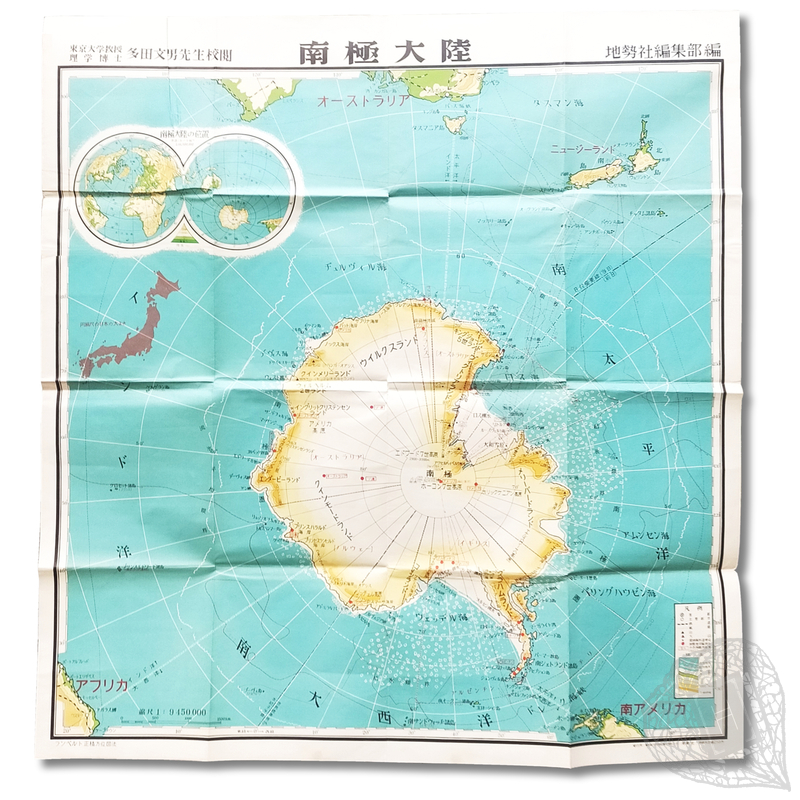 A large (115 x 109 cm) colour map of Antarctica produced in commemoration of the International Geophysical Year (also known as the IGY, 1957-1958). Professor Tada Fumio (1900-1978), who proofread the map, was a central figure in organising Japan's participation in the Antarctic International Cooperative Observation in the IGY. The map has a scale of 1:9,450,000, and place names are recorded in Japanese. The map comes with its original paper wrapper.